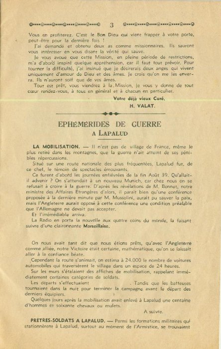 Notre voisin féru d’histoire, Roger, garde précieusement bien des documents et des photos anciennes, ce qui nous permet de pouvoir vous présenter les photos de l’abbé H. Valat (ministère 1924-1944). Il est resté sur Lapalud jusqu’à la fin de sa vie, et est enterré au cimetière avec ses soeurs ; la rue où il habitait porte encore son nom.